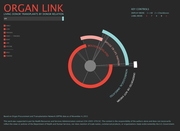 Interactive data visualization showing the donor recipient relations of living donor transplants. Application built with Processing.